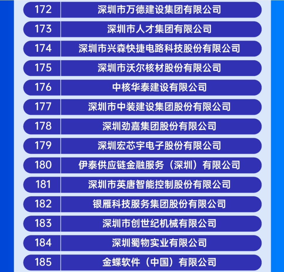 9月25日,深圳市企业联合会、深圳市企业家协会正式发布“2023深圳企业500强榜单”及《2023深圳500强企业发展报告》,作为中国建筑装饰企业的领军企业,中装建设凭借在业务领域发展成果和社会贡献,以及品牌良好的社会声誉,蝉联2023深圳企业500强,位列177名。